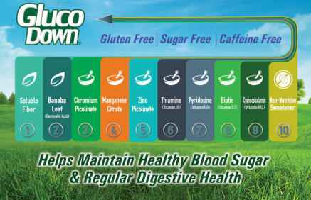 10 calories. GlucoDown® is also caffeine free (the tea mixes are